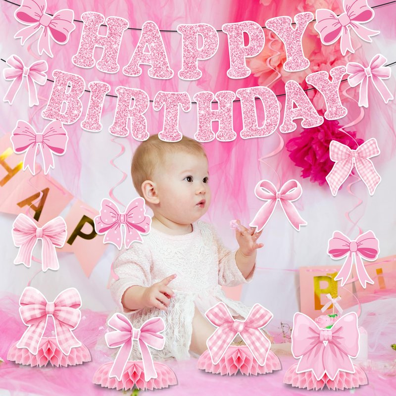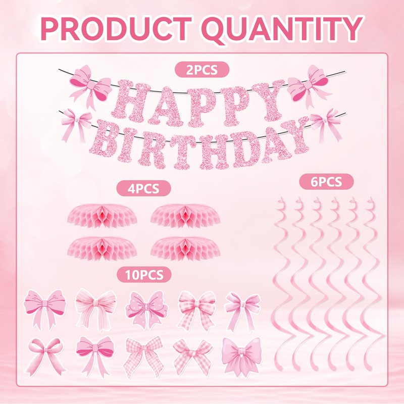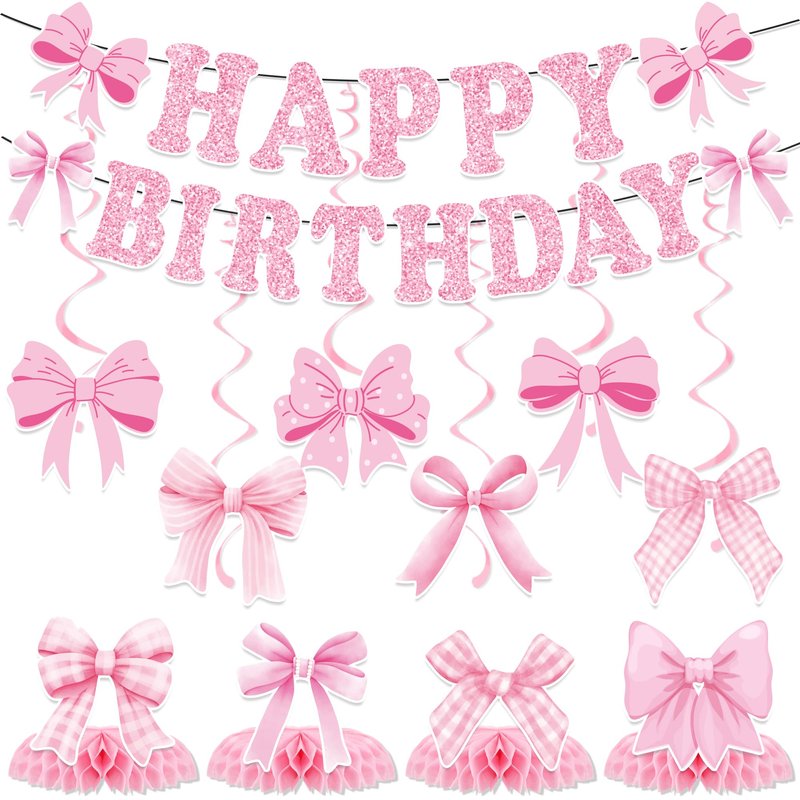 - Packing Include: This package includes 2 pcs coquete happy brithday themed banner and 10 pcs bow themed hanging swirls, 8 ribbons, along with 4 pink honeycomb centerpieces,offering a perfect combination to decorate your themed brithday parties
