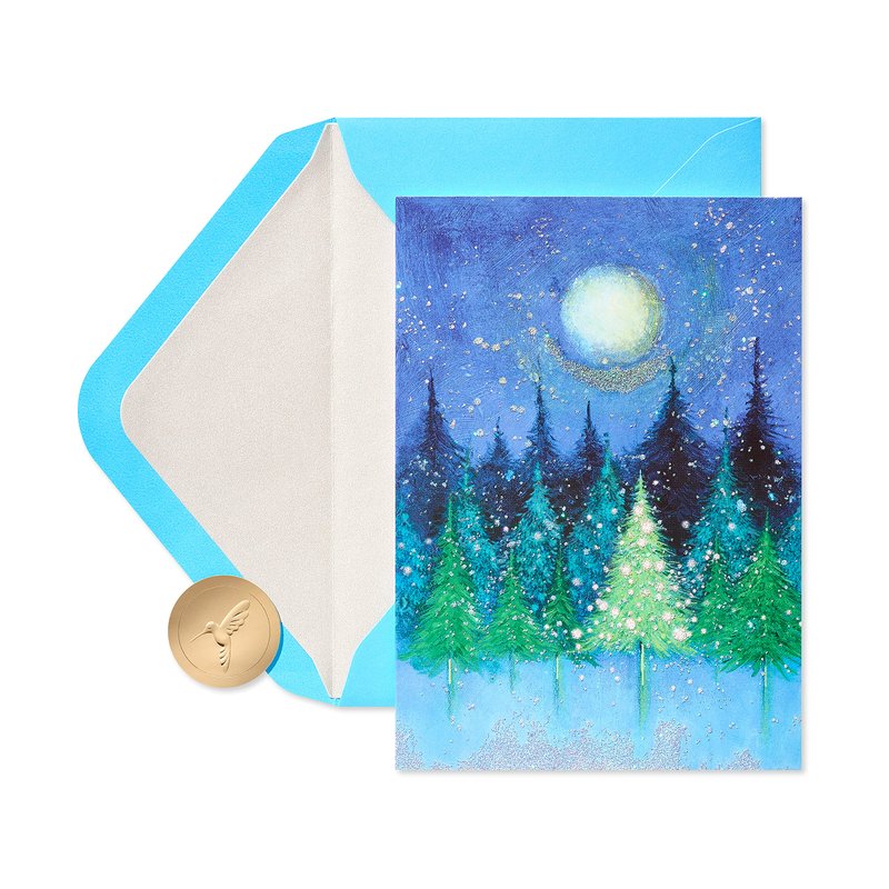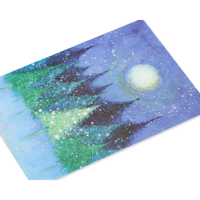 - These festive Christmas cards by Papyrus features a painted winter scene of trees embellished with shimmering glitter. Perfect for sending Christmas cards to friends, family or anyone this holiday season.