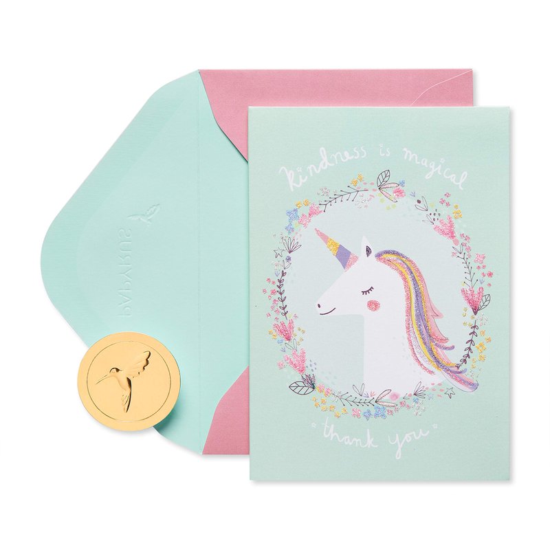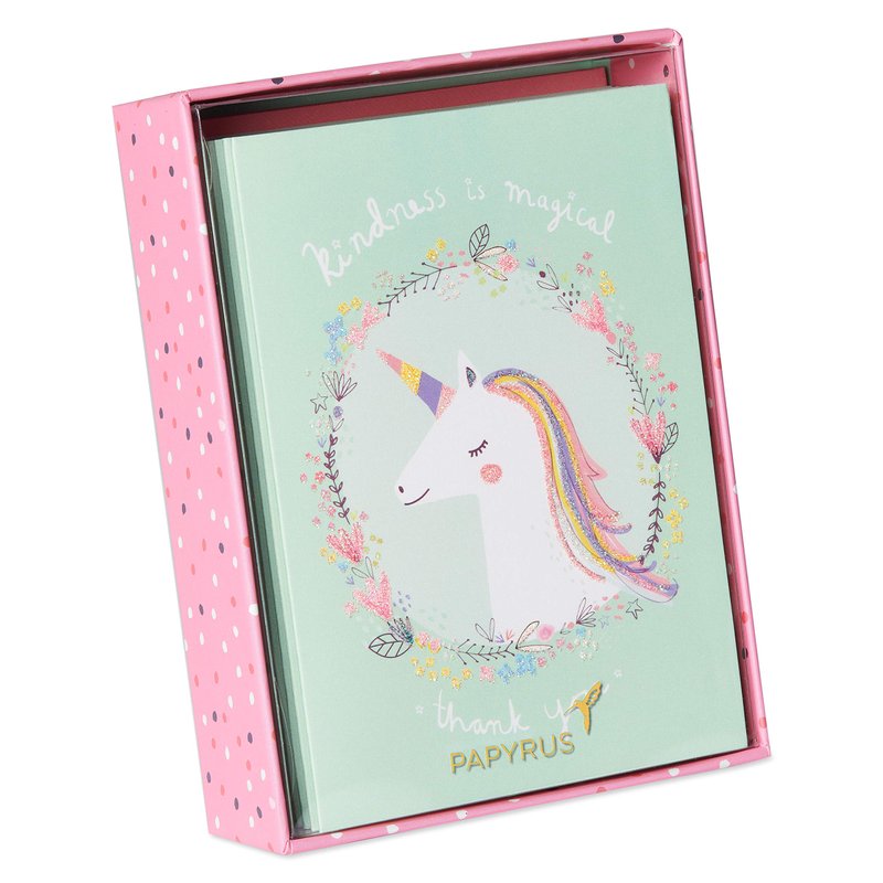 - Papyrus thank-you stationery cards feature a magical Unicorn design embellished with sparkling glitter and packaged in a matching printed box.