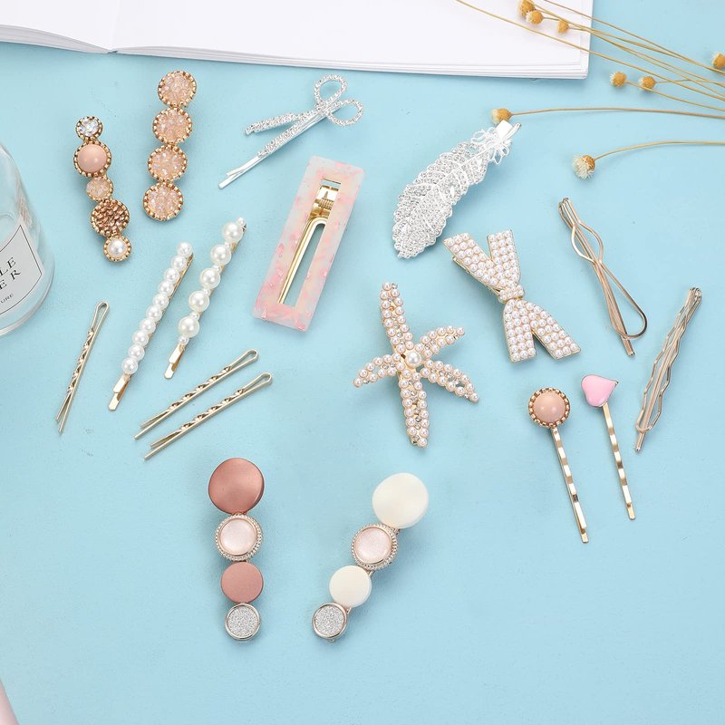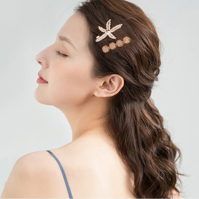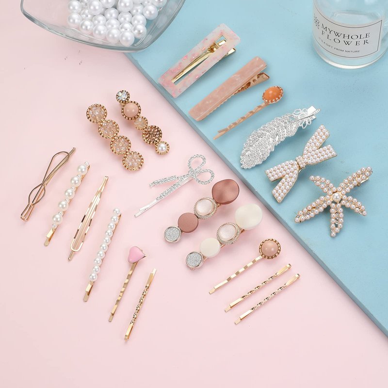 • 🎁【Great Value Set】4 pieces pearl hair clips & 2 pieces marble acrylic hair barrettes & 9 pieces Geometric Hairpins & 5 pieces pure metal pins. The are different cute styling with some hair clips, such as seastar, scissors and feather, which will match almost all outfits, hair colors and hairstyles.