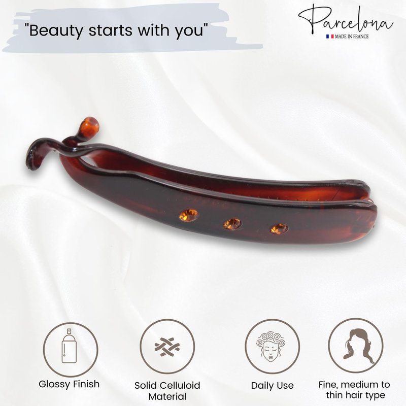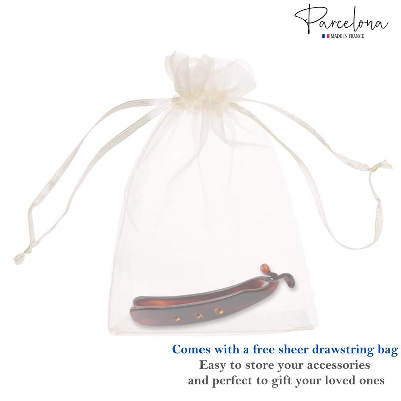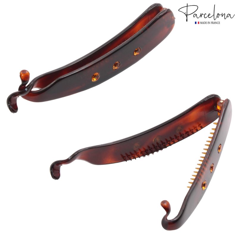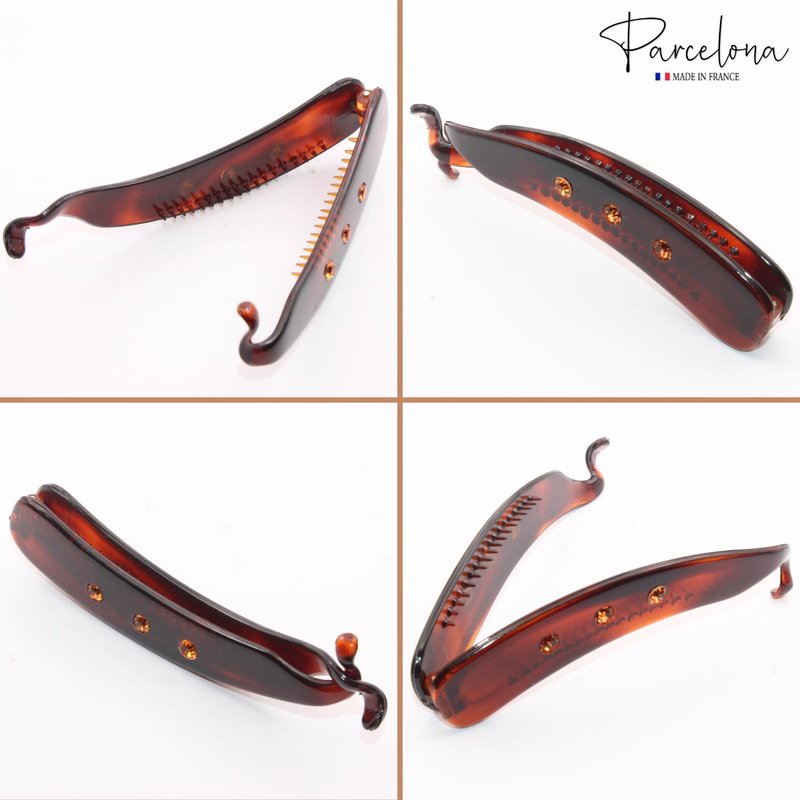 - This hair accessory is made in France with celluloid acetate. Our Parcelona hair ornaments are made in Europe, perfectly polished for a splendid finish, distinctive patterns, and designs. At Parcelona, the integrity and finest quality of products are guaranteed. Reach out to us for any kind of product related issue.
