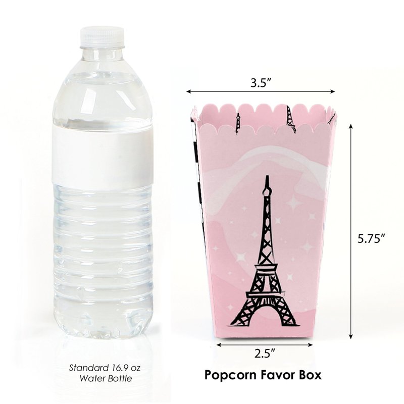 - Paris, Ooh La La party favor popcorn treat boxes SIZE 5.75 inches tall x 3.5 inches square at the top. The unique design and large size makes these 12 Eiffel Tower popcorn boxes are a must-have for any baby shower or birthday party.