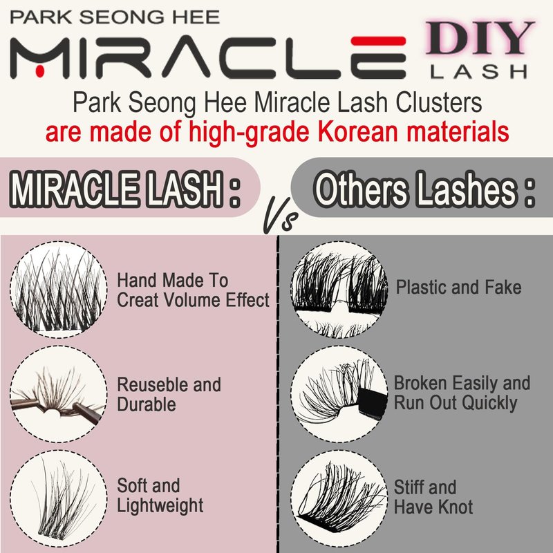 - Great Quality : Park Seong Hee Miracle Lash cluster are made of high-grade Korean materials and look real, not plasticky, gorgeous results, and lash clusters do not easily fall apart. They are reusable with proper care. Easy to take off and these individual eyelashes will not be broken when getting them off the backing with tweezers. The lash cluster extensions last for weeks. Soft, lightweight, vegan, knot-free, and matte dark.