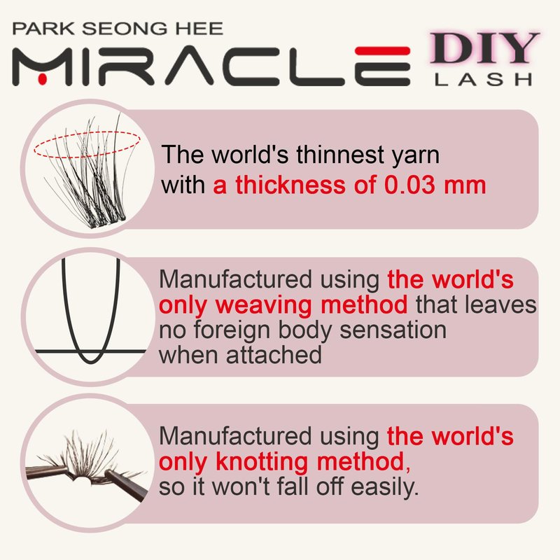 - Great Quality : Park Seong Hee Miracle Lash cluster are made of high-grade Korean materials and look real, not plasticky, gorgeous results, and lash clusters do not easily fall apart. They are reusable with proper care. Easy to take off and these individual eyelashes will not be broken when getting them off the backing with tweezers. The lash cluster extensions last for weeks. Soft, lightweight, vegan, knot-free, and matte dark.