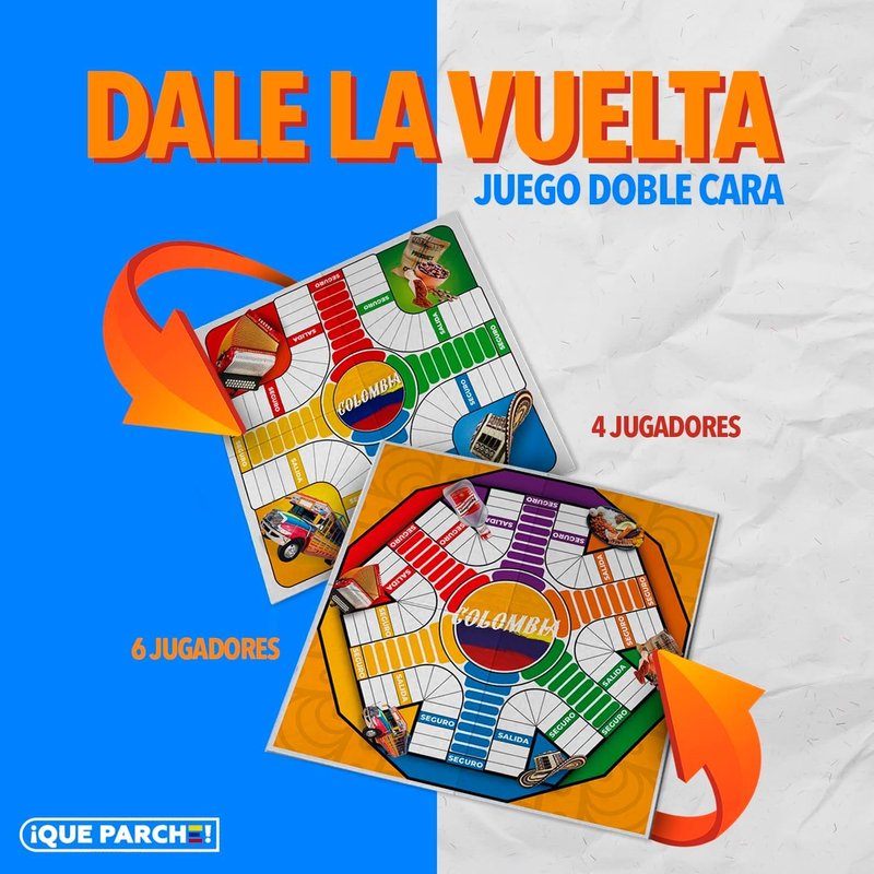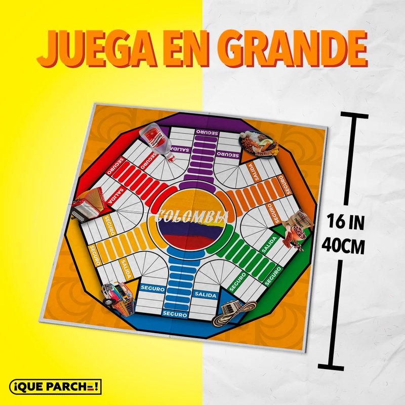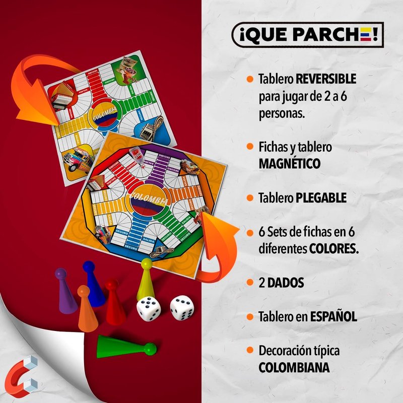 ¡Qué Parche! Juego de Parques Colombiano para 2 a 6 personas! Perfecto para recordar viejos tiempos con tus cuchos/padres, hermanos o primos, compañeros del colegio o los amigos del barrio de toda la vida. Contiene 24 fichas magnéticas y dos dados, y se dobla en 4 partes para que lo puedas guardar donde quieras. ¡El tablero es plegable y magnético, con un diseño de dos lados: un lado para jugar con 4 jugadores y el otro con 6 jugadores! Está decorado con imágenes que representan nuestra amada tierra COLOMBIA, y el diseño gráfico fue hecho por un colombiano, ya que hay que ser colombiano para saber lo que nos gusta. Es un juego ideal para adultos. Es recomendable a partir de los 21 años. Para los adultos, no importa la edad ni el lugar donde se juegue, lo importante es pasar buenos momentos con la gente que quieras disfrutar. It is an ideal game for adults. Play anywhere with your family and friends; for 2 to 6 players age 21 and up. Includes 24 magnetic pawns and a pair of dice. Pick your favorite color and have fun. It does not matter if you are Colombian or from any other country, we are sure that you are going to have fun and you will remember it for ages.