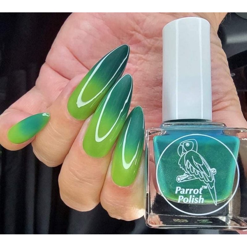 Allamanda thermal nail polish features a gorgeous and colorful blend that changes depending on the temperature. This beautiful green polish transforms to a lighter lime green as it warms up. A vibrant color-changing polish, the colors blend beautifully on natural or acrylic nails and can be layered for a deeper overall color. Providing a bold color combo for optimal dramatic effect, this temperature-based polish can be used with various application techniques like water marbling to create a gorgeous work of art for your nails. This salon quality nail polish dries to a matte finish, but a clear top coat can be added for a sophisticated, glossy shine. Our line of thermal polishes are easy to apply, and dry quickly with a smooth finish. As with all of our Parrot Polish products, non-toxic Allamanda thermal nail polish is cruelty-free and 10-free.