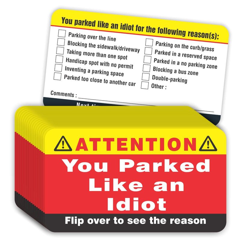 • IMPOSSIBLE TO IGNORE - You can also write your own comments in writable area at back side to tell someone why they park like an idiot. Leave on careless driver’s under the windshield wiper, through the driver’s door window, will send a strong message to them. EXCELLENT NOVELTY GAG GIFT