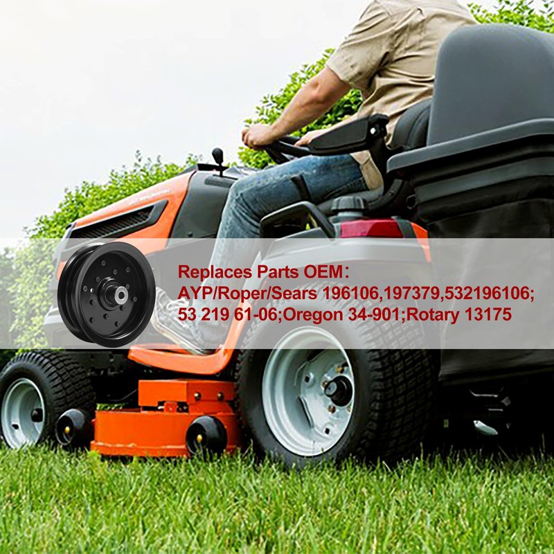 This Pulley is built to meet or exceed OEM Standards. Replaces AYP/Roper/Sears 196106,197379,532196106; 532 19 61-06,Oregon 34-901,Rotary 13175; Fits: Craftsman: 944,917, Poulan: PB19546LT; Size: 5-3/8" outer diameter, 3/8"inner diamter, 1-5/8" height; Package Includes:1 pulley as pictured.
