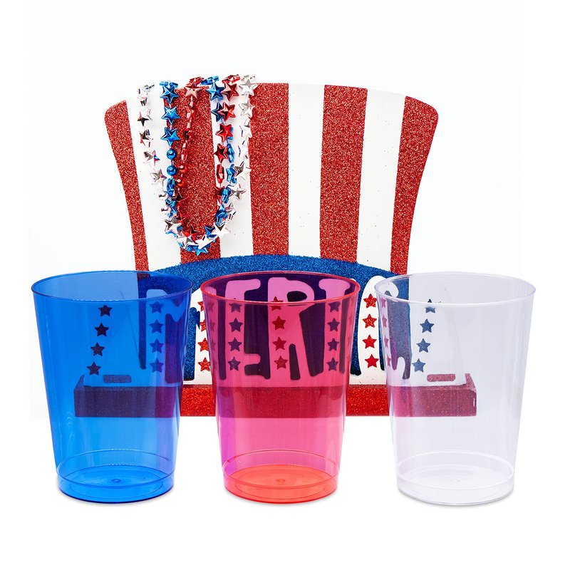 - Party Essentials Assorted red, clear and blue 10 oz. party cups add plenty of spirit to Memorial Day, Independence Day, Veterans Day, or any patriotic celebration