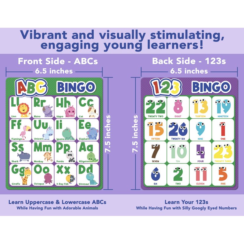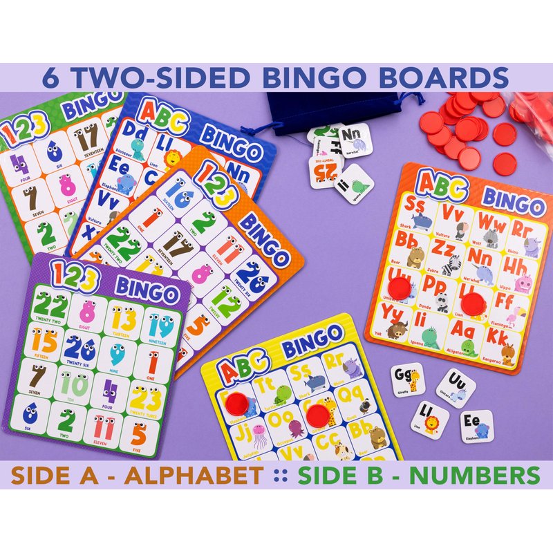 - 🇺🇸 We are a small business from the USA. Our products are proudly designed in Portland, OR, USA. ✔️Classic Game for Learning - This classic Bingo Board Game is a perfect fun way for kids to learn their ABCs and 123s. It includes 6 double sided game boards, 26 letter and number tokens, 72 chips to mark your board, velvet bag to store your tokens, instructions and a sturdy box to house all your game pieces.