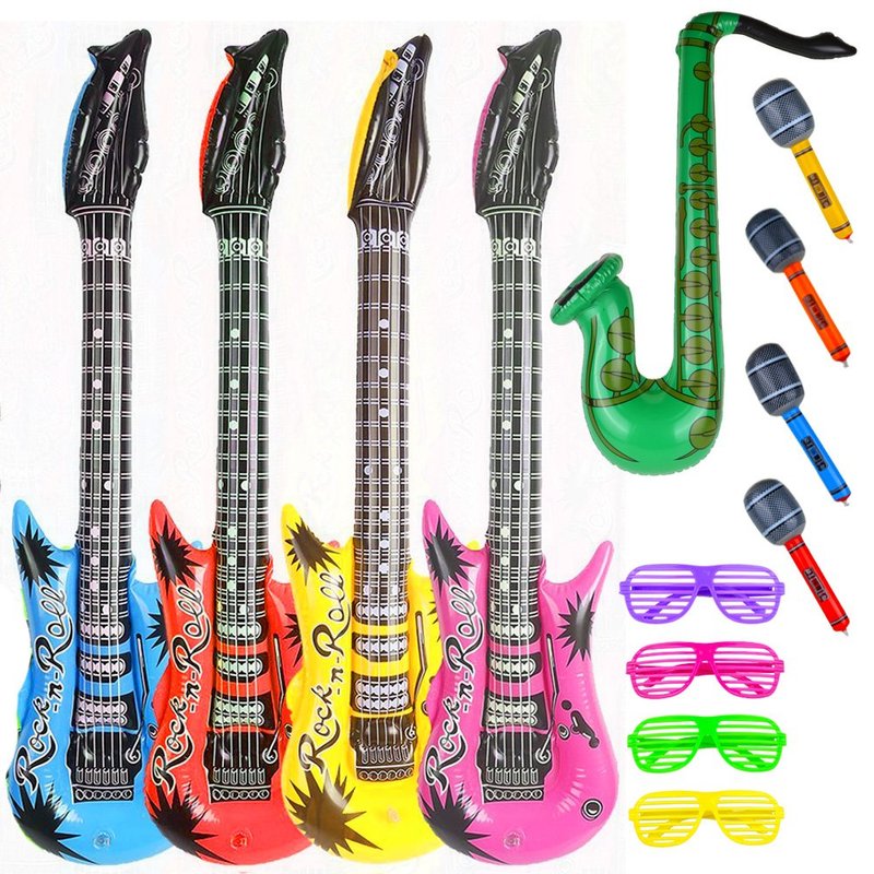 - BEST COMBINATION:Includes 4 inflatable guitars, 4 inflatable microphones,4 shutter shading glasses and 1 inflatable saxophone.