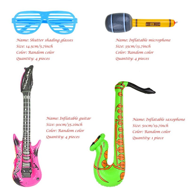 Includes:4 Inflatable Guitars,4 Inflatable Microphones,4 Shutter Shading Glasses and 1 Inflatable Saxophone.