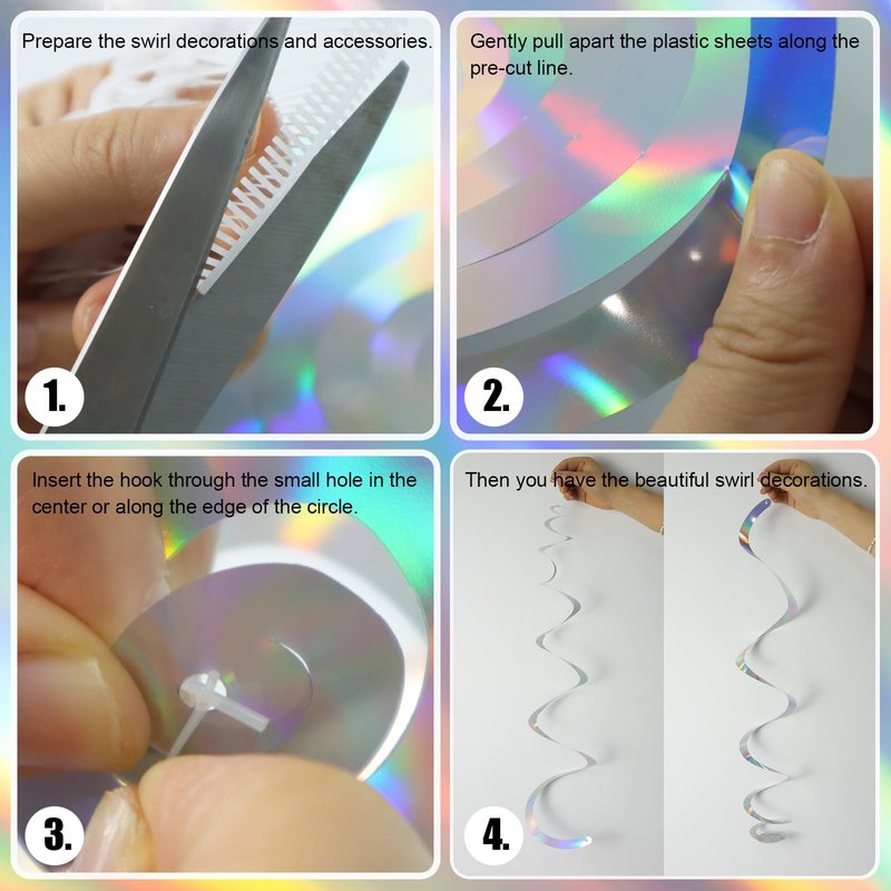- Easy Installation: There is a small loop on the iridescent hanging swirls. You can just hang it in the desired decoration spot and carefully separate it along the edge of the party swirl hanging decorations to let it drape down slowly. Then you can have an eye-catching metallic whirls decorations effortlessly. It might take some time, but it's definitely worth it.