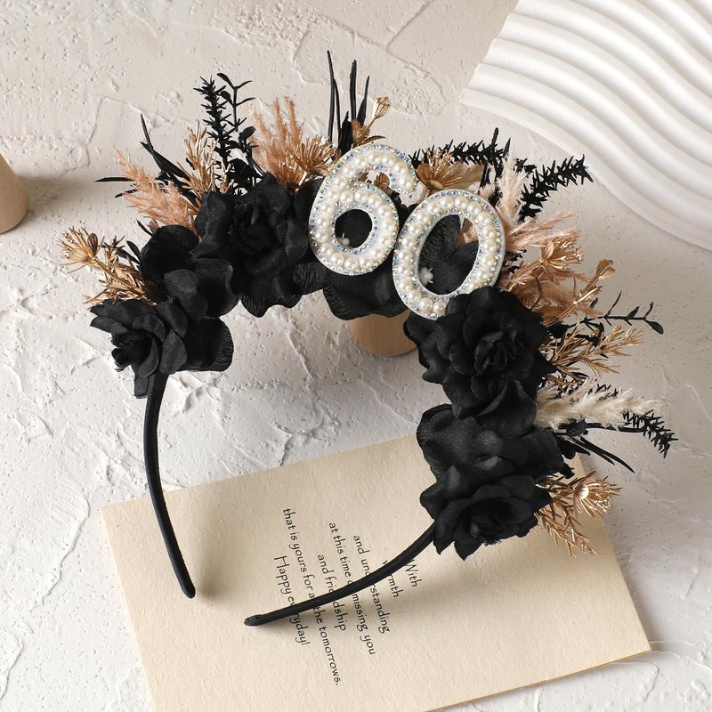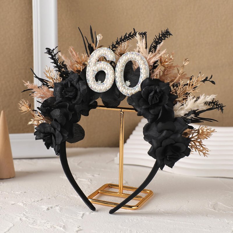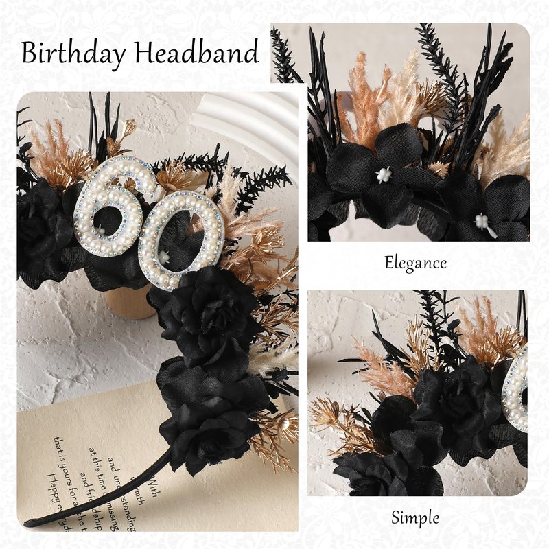 - Celebrate 60th Birthday: Celebrate your wonderful 60th birthday with our beautiful headband that features an elegant "60" adorned with shimmering pearls and black flowers. This birthday accessory enhances your special day