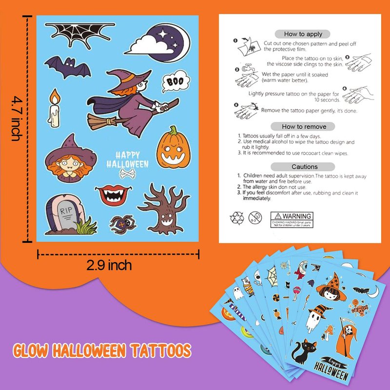 - 【Luminous Halloween Theme Temporary Tattoos for Kids】Luminous Halloween theme temporary tattoos for kids. Even at a night party with lots of people, these luminous tattoos will make you unique among the crowd! These super cute elements in our Halloween themed fake tattoos include pumpkins, zombies, skeletons, witches, lanterns, black cats and other Halloween-related patterns!