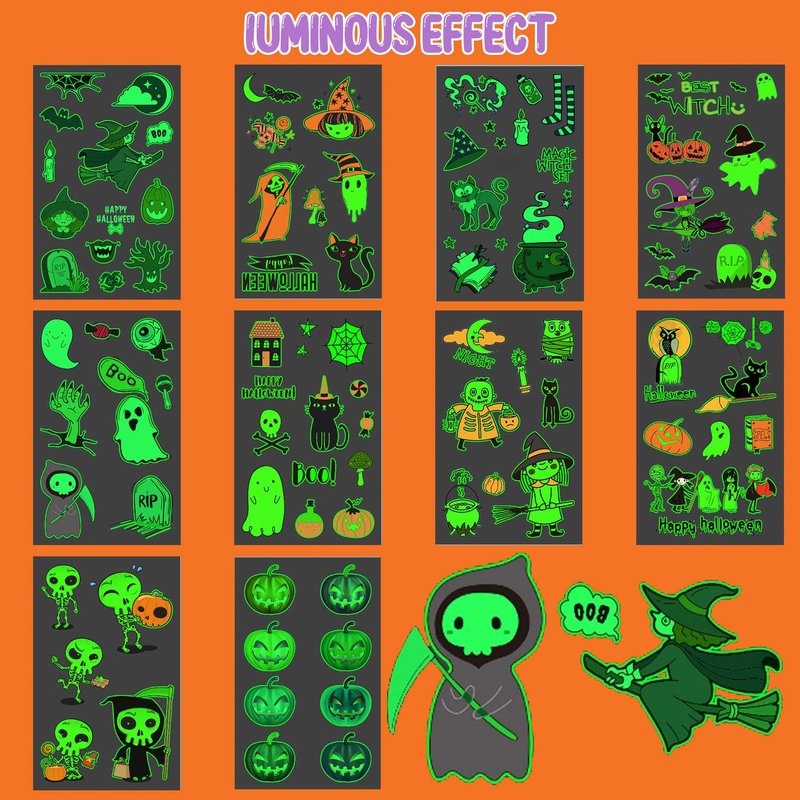 10 sheets luminous Halloween theme temporary tattoos for kids.