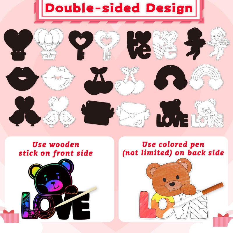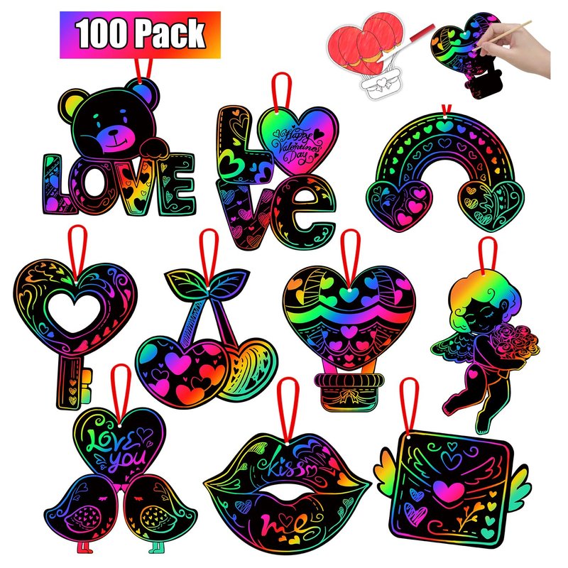 - 【100 Pack Valentines Scratch Paper Art】Package include 100 PCS Valentines scratch papers, 50 PCS wooden styluses and 100 PCS cords. Easy to get a magic and colorful Valentines craft even a little kid. It's a fun Valentines school or classroom activity for kids to use their imagination.