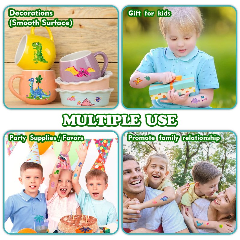 - 【Glitter Dinosaur Tattoos for Kids Party】Are you looking for some unique party supplies for kids dinosaur party? Partywind tattoos maybe a good choice for you! No kids can refuse these glitter tattoo stickers! Each sheet includes various colorful and glitter dinosaur patterns. Kids will love these dinosaur tattoos!