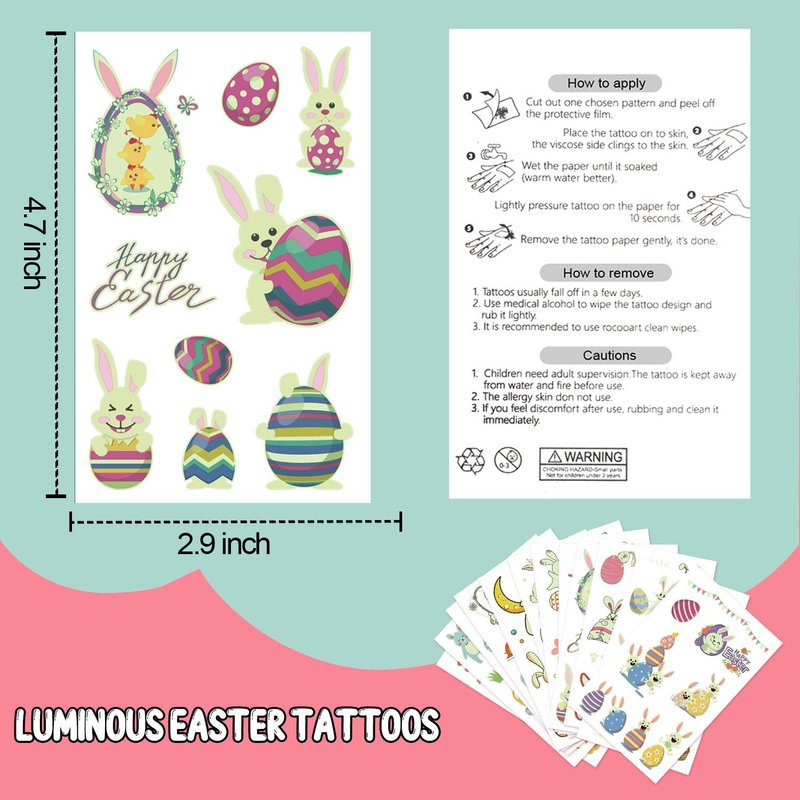 - 【Simple to Use and Remove】Choose the pattern you like, and then face down on skin, wet the temp tattoo with water and wait for 10 seconds. Then gently tear off the white surface. You will get a luminous Easter tattoo! Luminous tattoos need to be activated under light for a few minutes, which can make them more luminous in the dark.