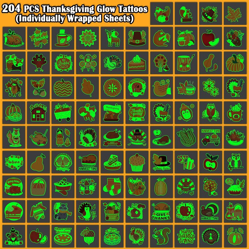 204 Different sheets cute luminous Thanksgiving temporary tattoos for kids boys girls. (Individually Wrapped Sheets)