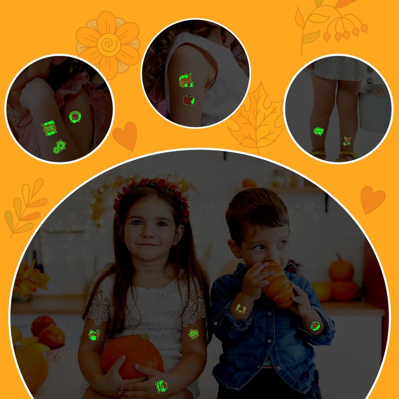 - 【Glow Thanksgiving Tattoos for Kids Party Supplies】Super glow Thanksgiving tattoos for kids. Even at a night party with lots of people, these glow tattoos will make you unique in the crowd! These cute elements of our fake tattoos include Turkey, Pumpkin, Maple Leaf, Cake and other favorite patterns that kids will like!