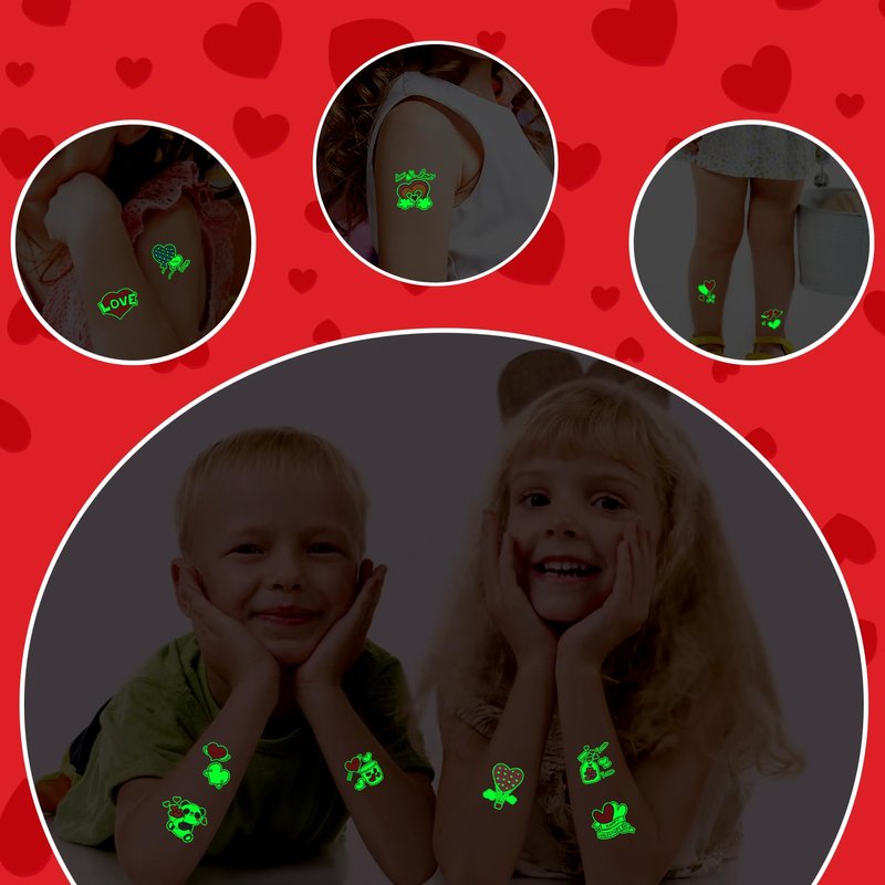 - 【Luminous Valentine's Day Tattoos for Kids】Super glow Valentines tattoos for kids. Even at a party with lots of people, these glow tattoos will make you unique in the crowd! These cute elements of our fake tattoos include Heart, Flowers, Rose, Lips, Cake and other favorite patterns that kids will like!