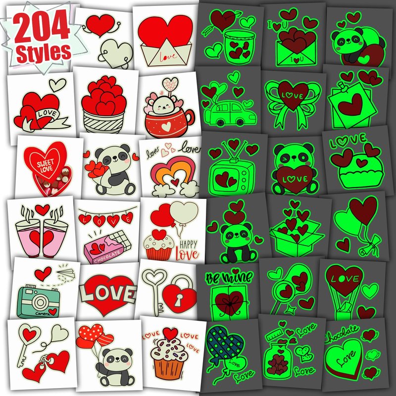 204 sheets luminous Valentines tattoos stickers for kids boys girls toddlers children.