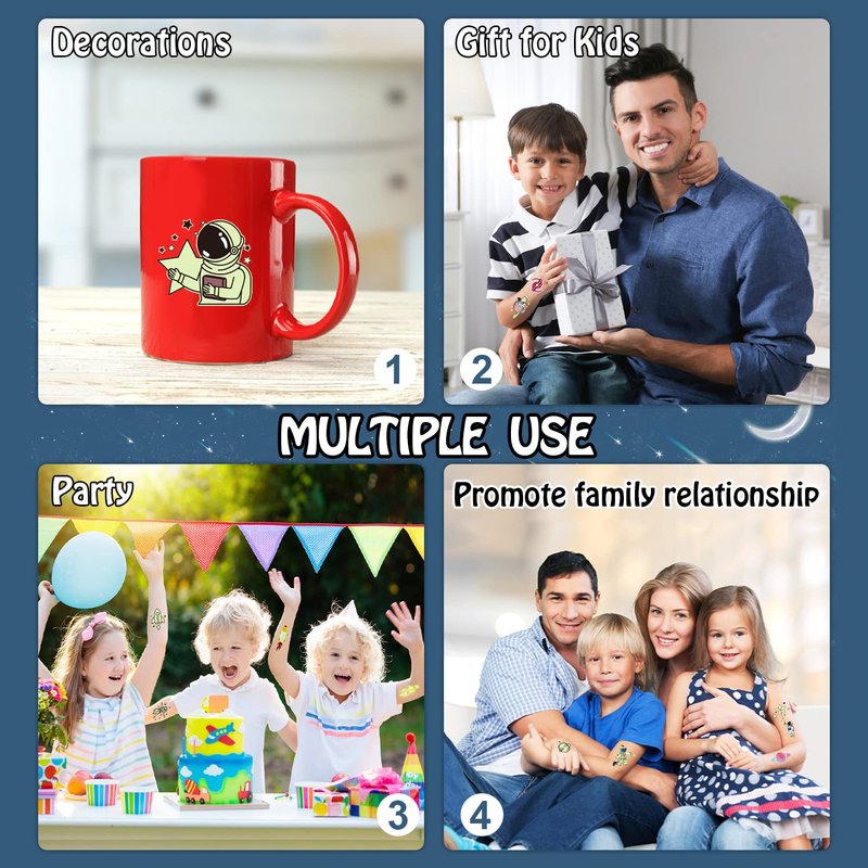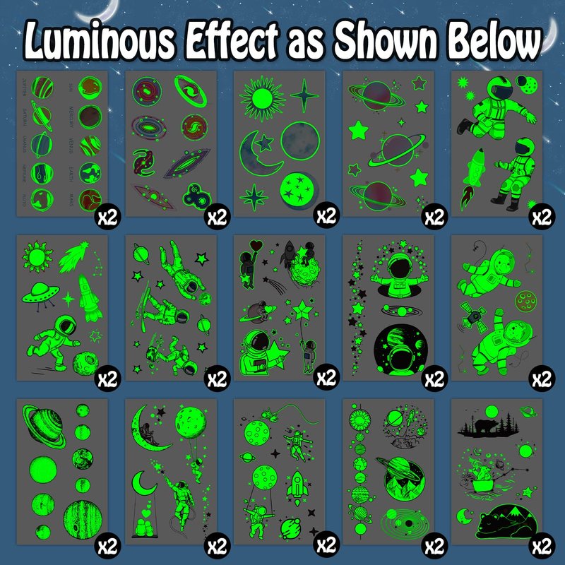 - 【Quantity and Quality】Package contain 30 sheets (225 PCS) luminous space tattoos for kids and suitable for boys, girls, toddlers, this means that every kid at the party can get a luminous space tattoo and share them to friends. Each sheet measures 4.7 " x 2.9 ". Our temp tattoos undergo rigorous party testing, the fake tattoos will last all day or more.