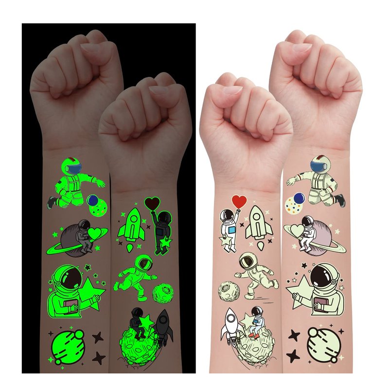 - 【225 Styles Luminous Outer Space Kids Tattoos】Super hit luminous space styles temporary tattoos for kids. Even at a party with lots of friends, these glow tattoos will make you unique in the crowd! These super fun elements of our fake tattoos include various Astronauts, Planets, Moons, Stars that kids will like. Explore the universe at nigh!