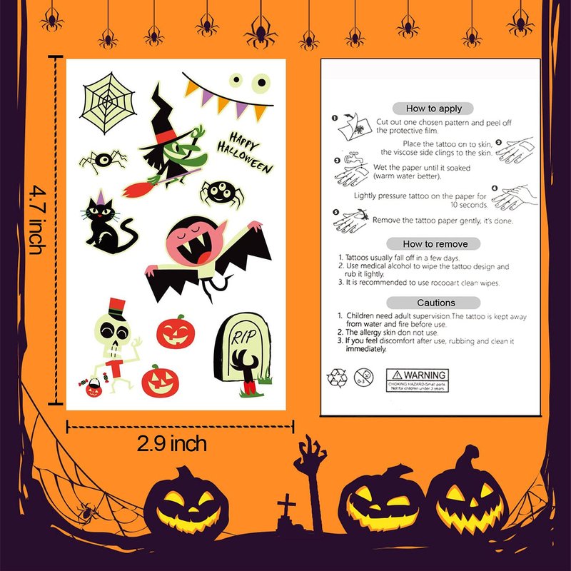 - 【Glow Halloween Party Supplies for Kids】Glow Halloween tattoos for kids boys girls. Even at a night party with lots of people, these luminous tattoos will make you unique among the crowd! These super cute elements in our Halloween fake tattoos include zombies, skeletons, vampire, pumpkins, witches, lanterns, black cats and other Halloween-related patterns!