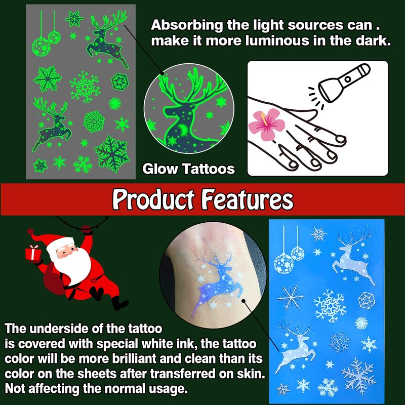 • 【Simple to Use and Remove】Choose a pattern you like, and then face down on skin, wet the temp tattoo with water and wait for 10 seconds. Then gently tear off the white surface. You will get a glow Christmas tattoo! Luminous tattoos need to be activated under light for a few minutes, which can make them more luminous in the dark.