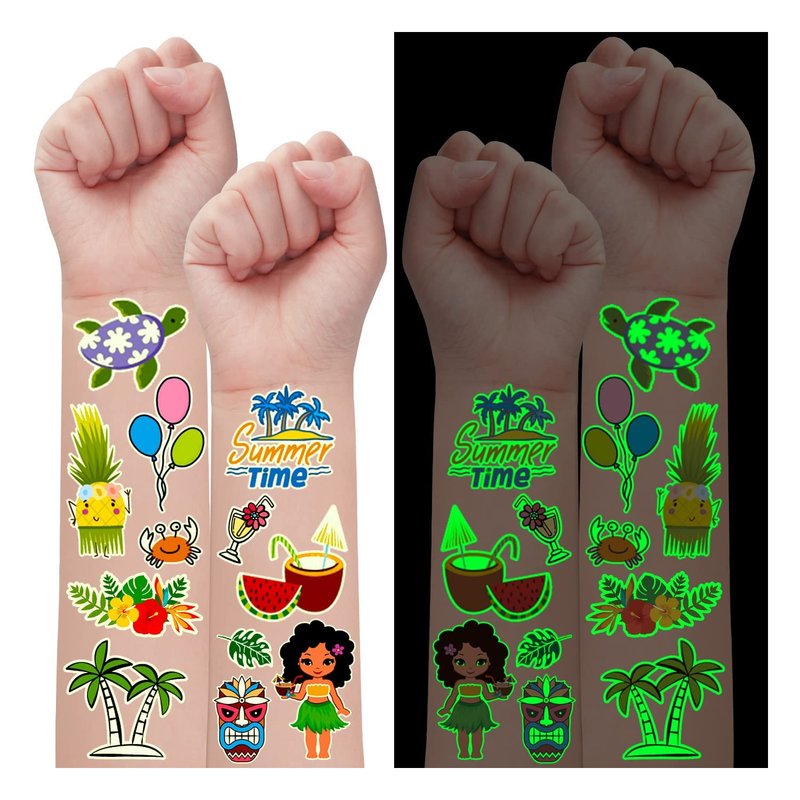- 【Luminous Hawaiian Tattoos for Kids Party】Various luminous Hawaiian temporary tattoos for kids with Pineapples, Flamingo, Hibiscus Flowers, Palm Trees, and other favorite patterns that kids will love! These glow tattoos will make you unique in the crowd!