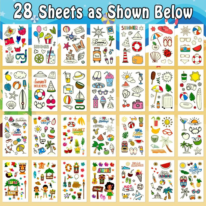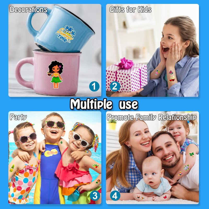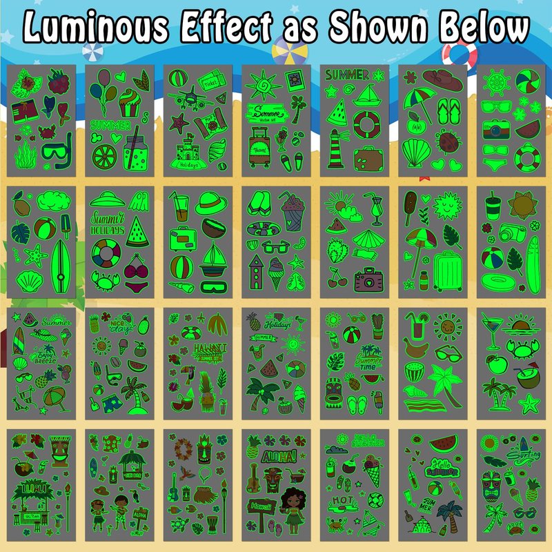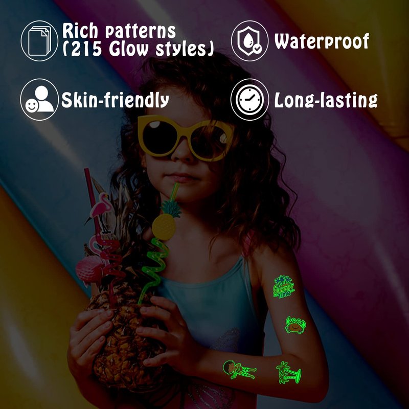 - 【Applicable Place】These glow temporary tattoos are perfect for Hawaiian/luau/tropical/pool/summer/beach kids party supplies, birthday party decorations, party favors, gifts for kids, games, goodie bag stuffers. You can also apply them on some smooth objects, such as glass, tile, water bottle, stainless steel, plastic, phone case and so on.