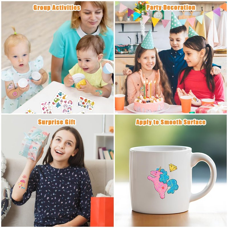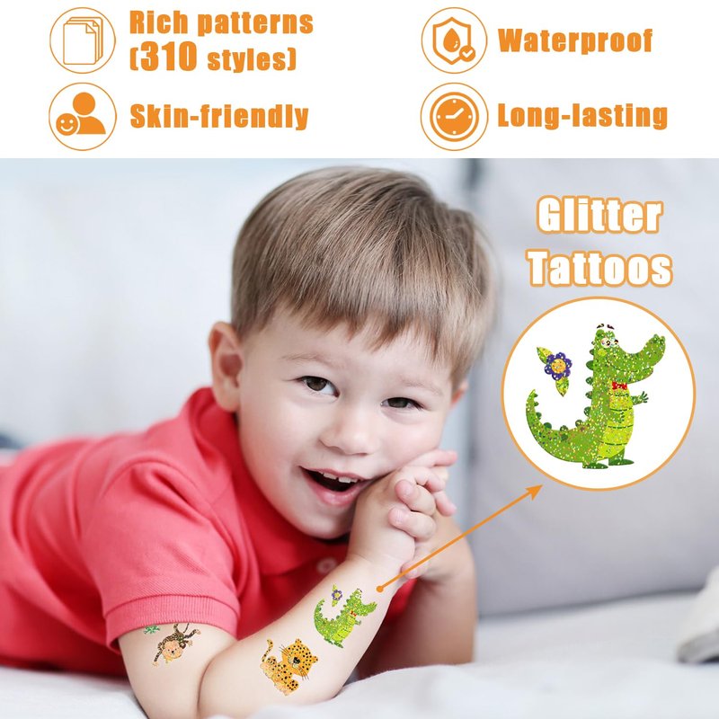 - 【Glitter Tattoos for Kids Party Supplies】Various glitter mixed styles temporary tattoos with dinosaur, mermaid, animals and other cute patterns! These glitter tattoos will make kids unique and shine at various party!