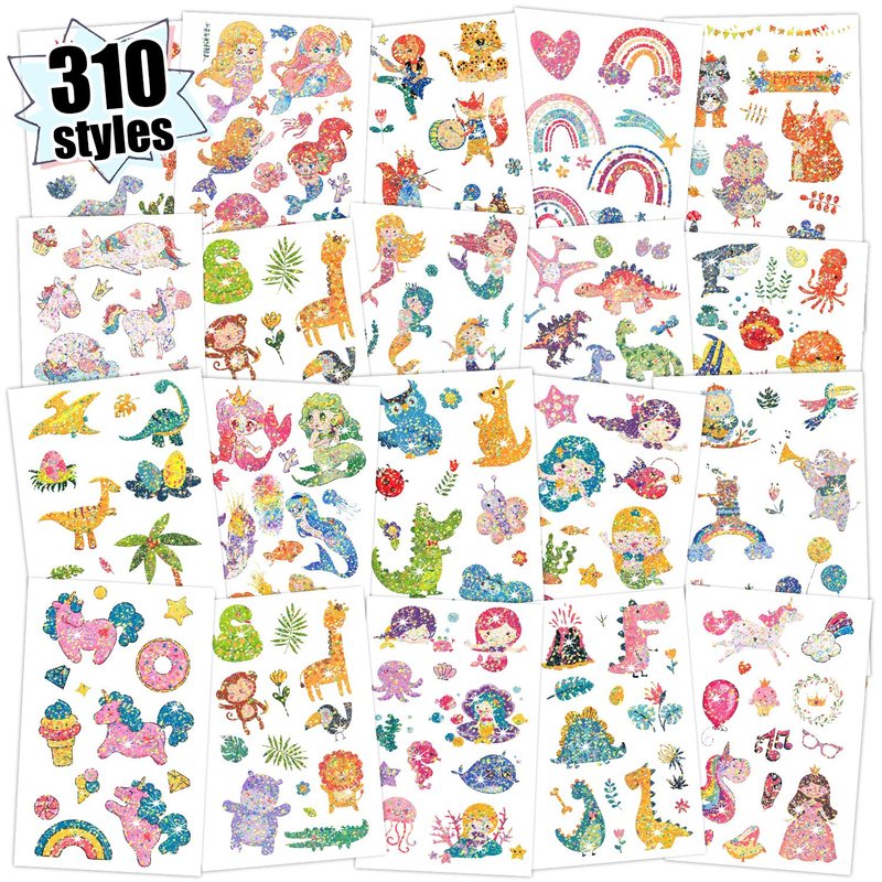 Partywind 310 Styles Glitter Party Supplies for Kids, Temporary Tattoos for Kids Birthday Party Decorations Favors, Surprise Goodie Bag Stuffers with Dinosaur/Mermaid/Animals (28 Sheets)