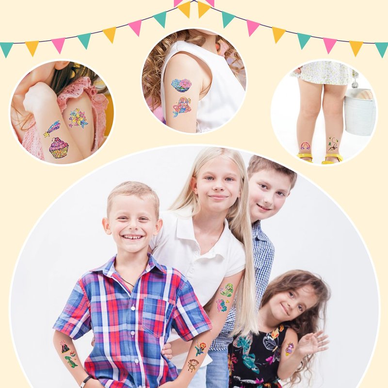 - 【Glitter Designs & No Duplicates】310 Styles (28 Sheets) Glitter temporary tattoos designed by Partywind, incorporating the popular and cute elements. No repeating patterns and great choice as goodie bag stuffers to give your kids and guest a big surprise!