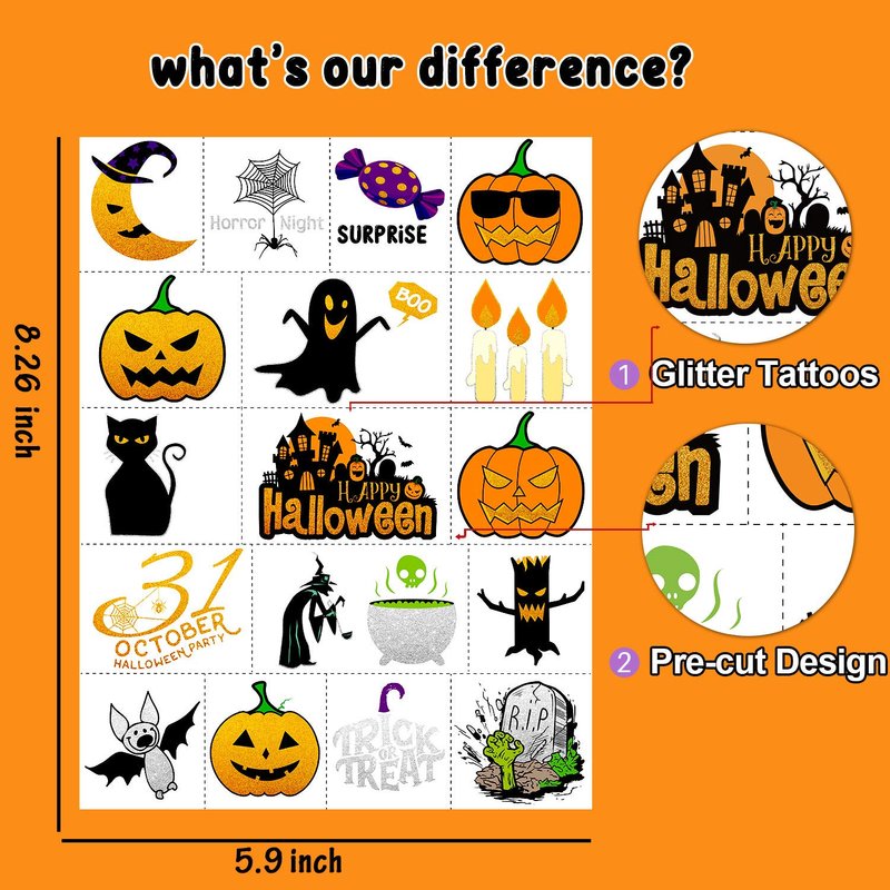 - 【Metallic Glitter Tattoos for Halloween Theme】The feature of metallic gold + metallic silver makes you shine in the Halloween party. Various super cute Halloween unique designs include pumpkin, tombstone, ghost, witch, bat, cat, candy, candle and other kid’s favorite elements that kids will love. Let us enjoy the happy Halloween!