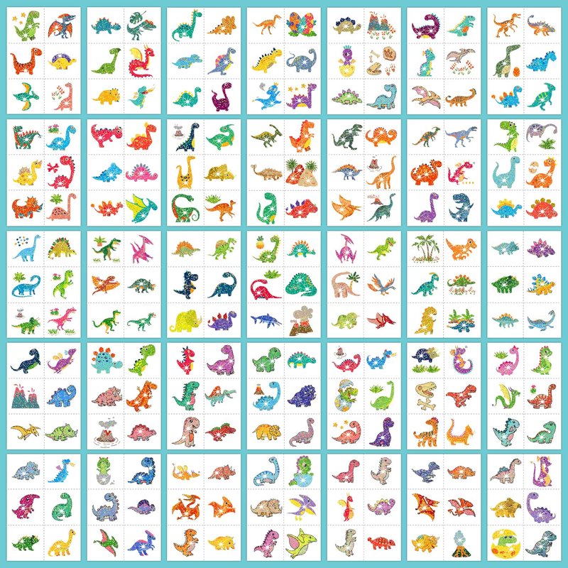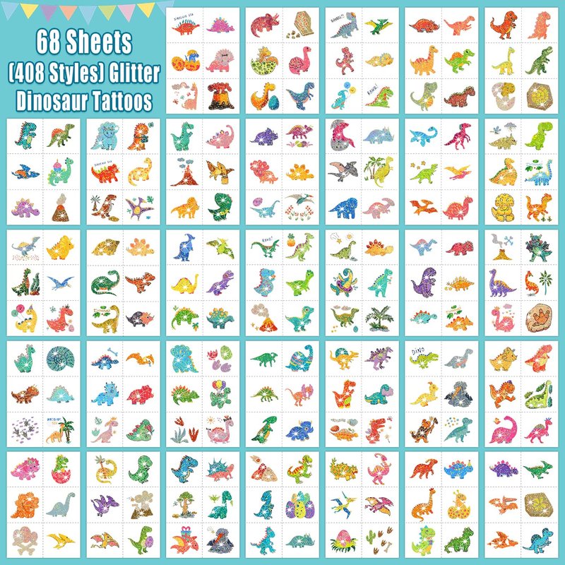 - 【408 Styles Glitter Dinosaur Tattoos for Kids】Package includes 408 Styles dinosaur tattoos stickers (68 Sheets X 6 PCS). These cute elements of our fake tattoos include various cartoon dinosaurs and other favorite patterns that little dinosaur fans will like!