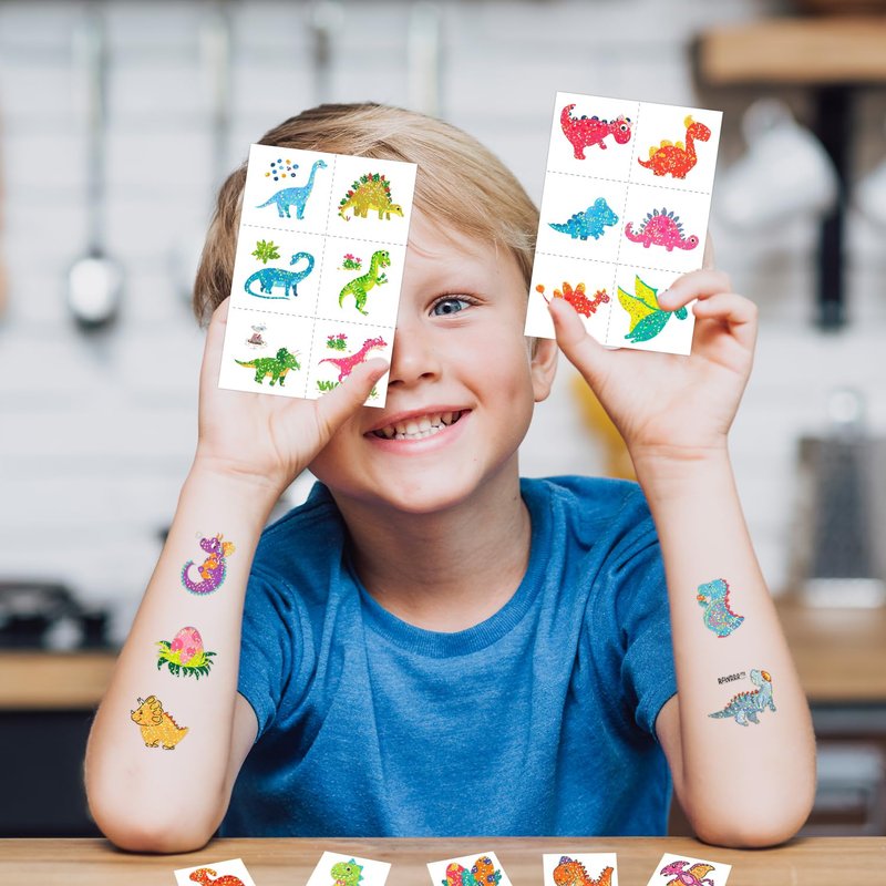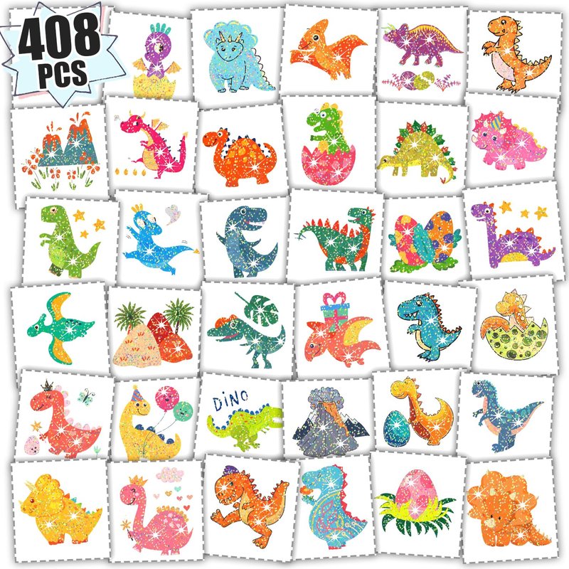 - 【Glitter Dinosaur Party Accessories】These tattoos stickers are suitable for kids dinosaur party supplies, party favors, party decorations, goodie bag fillers, kids stocking stuffers, games, toys, decor, prizes and so on. You can also apply them on some smooth objects, such as glass, tile, water bottle, plastic, phone case and so on.