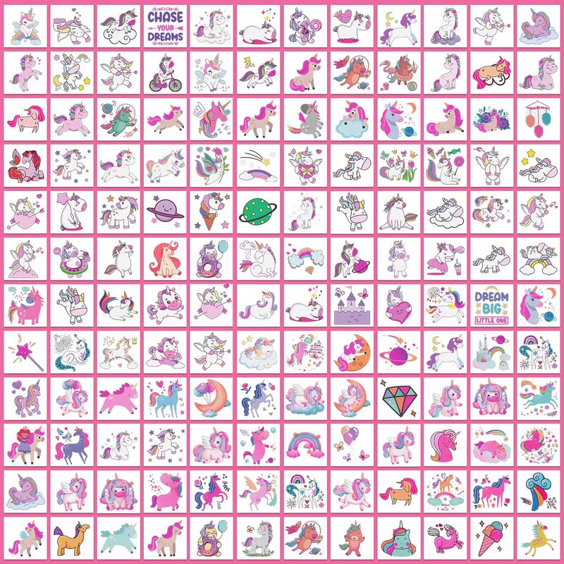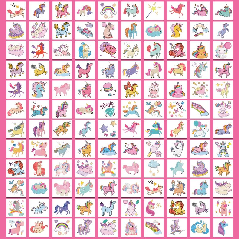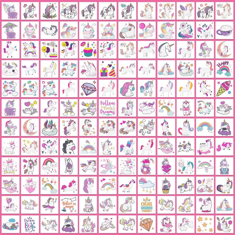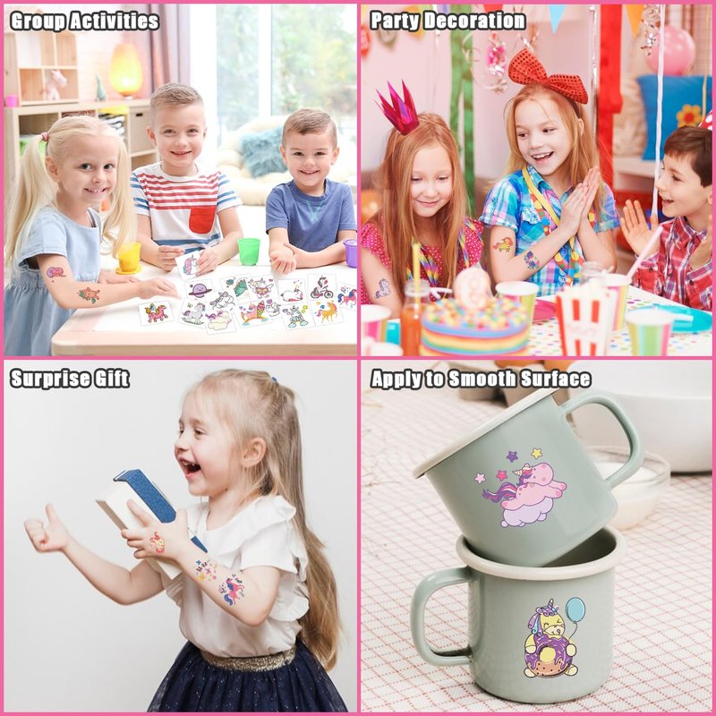 - 【Easy to Get Fun】Choose the pattern you like, and then face down on skin, wet the temp tattoo with water and wait for 10 seconds. Then gently tear off the white surface. You will get a cute kids tattoo! Great stuff for birthday party games, toys for girls, prizes.