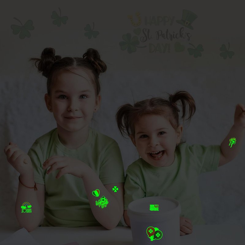 - 【Luminous St Patrick's Day Temporary Tattoos for Kids】Even at a party with lots of people, these glow tattoos will make you unique in the crowd! These super cute elements of our temp tattoos include Shamrock, Gold Coin, Leprechaun, Horseshoe, A Pot of Gold, Rainbow, Hat, Irish Flag and other favorite patterns that kids like!