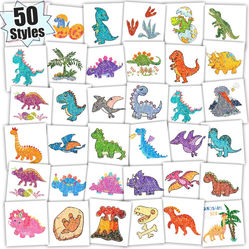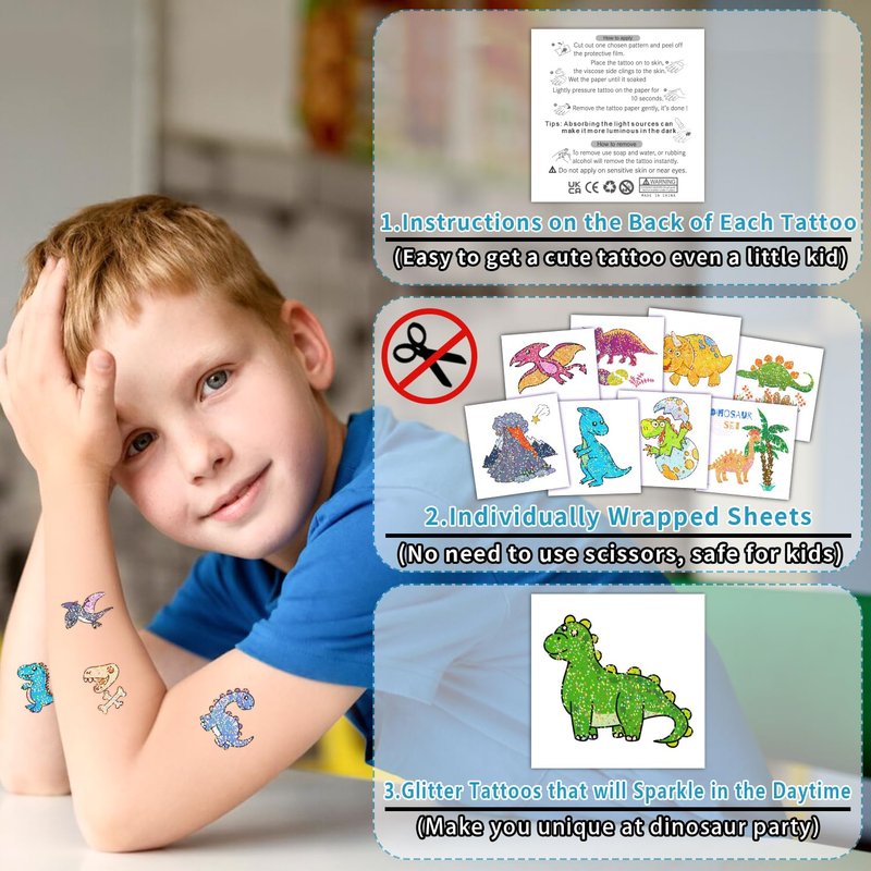 - 【Great Value Packs】Package include 50 PCS glitter dinosaur tattoos in total! Partywind tattoos undergo rigorous party testing, the fake tattoos will last all day or more. Special glitter party accessories for little dinosaur fans!