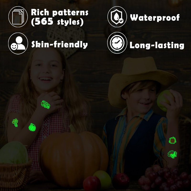 - 【Waterproof and Luminous Tattoos】56 Sheets (565 Different Styles) in total! Partywind Thanksgiving tattoos undergo rigorous party testing, the fake tattoos will not come off easily and stay on skin all day or more. Very suitable for kids to play and share with friends.