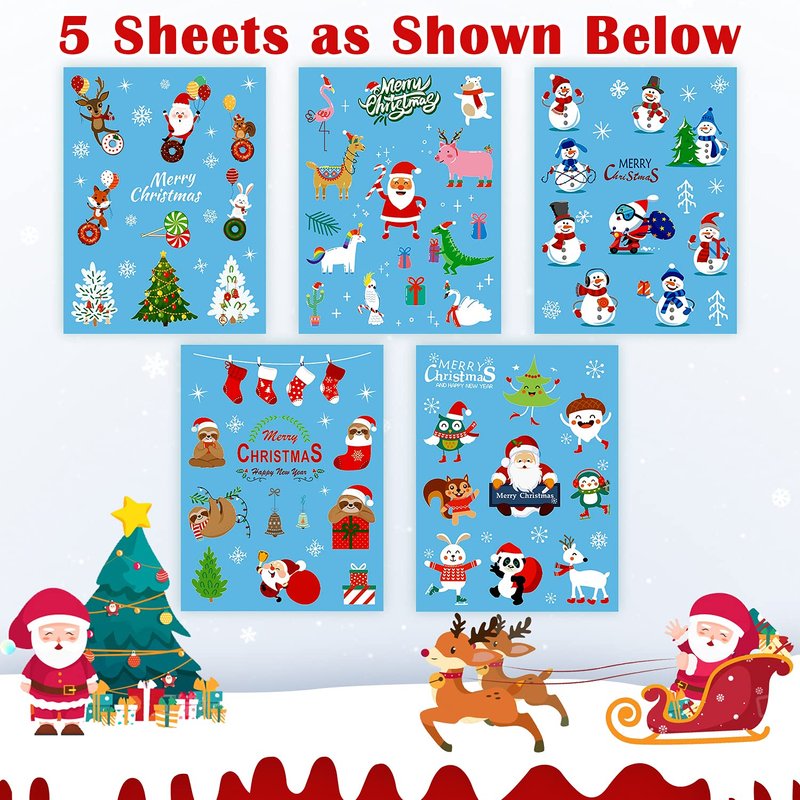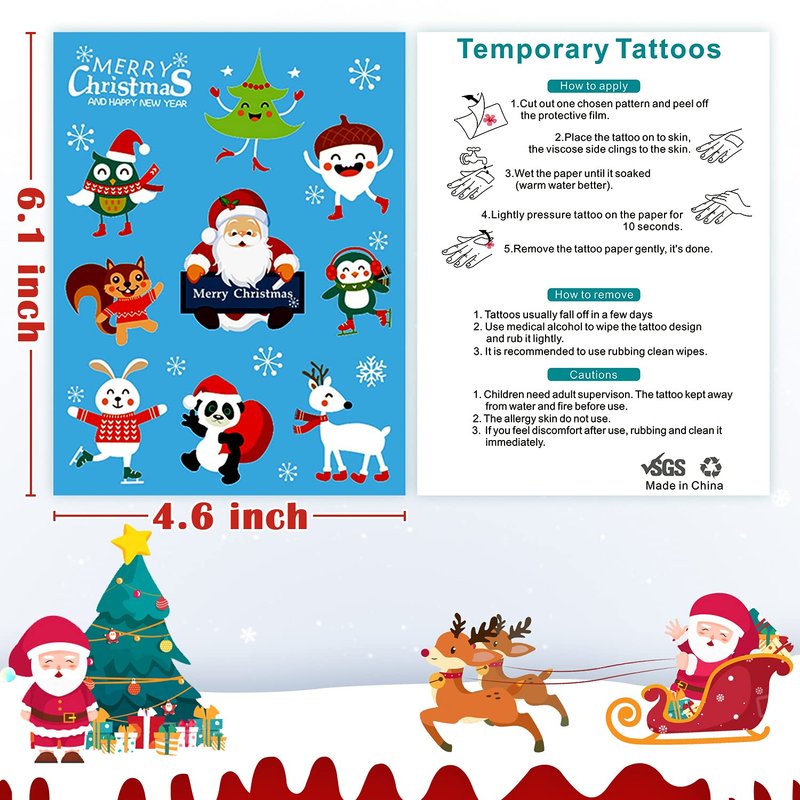 - 【Multi-purpose】Each sheet measures 8.25 " x 6 ". There are many ways to use our Christmas theme temporary tattoos, you can apply them on Christmas stocking stuffers, party decorations, party favors, party supplies, party games, goodie bags, and so on. Also can be a Christmas surprise for kids!