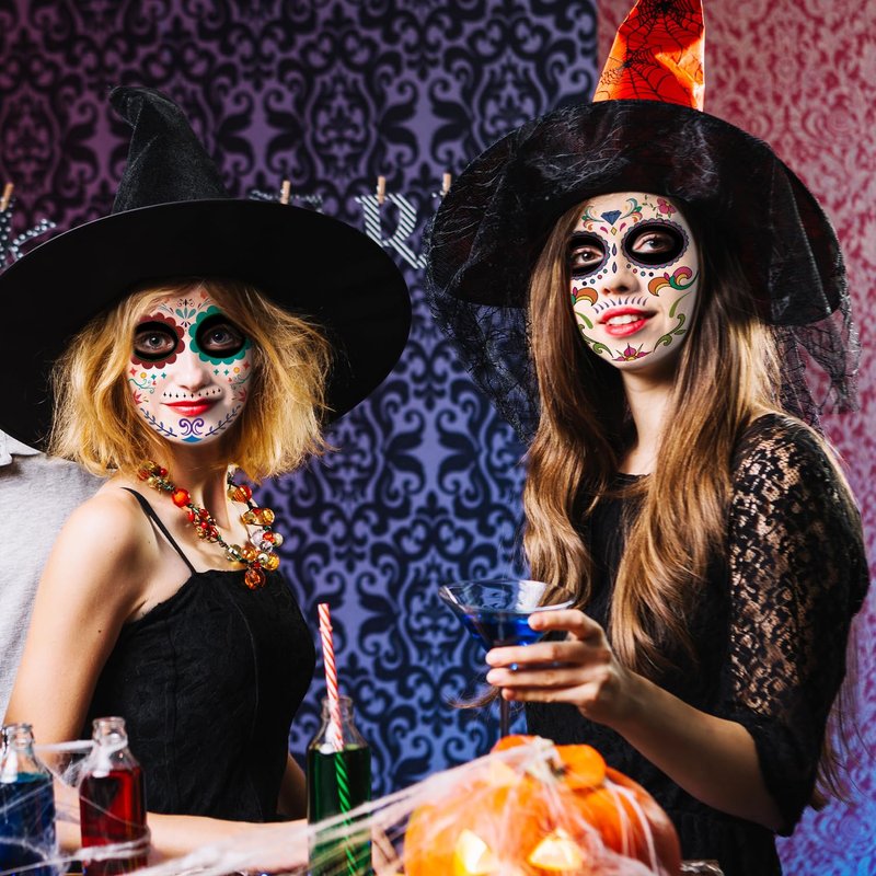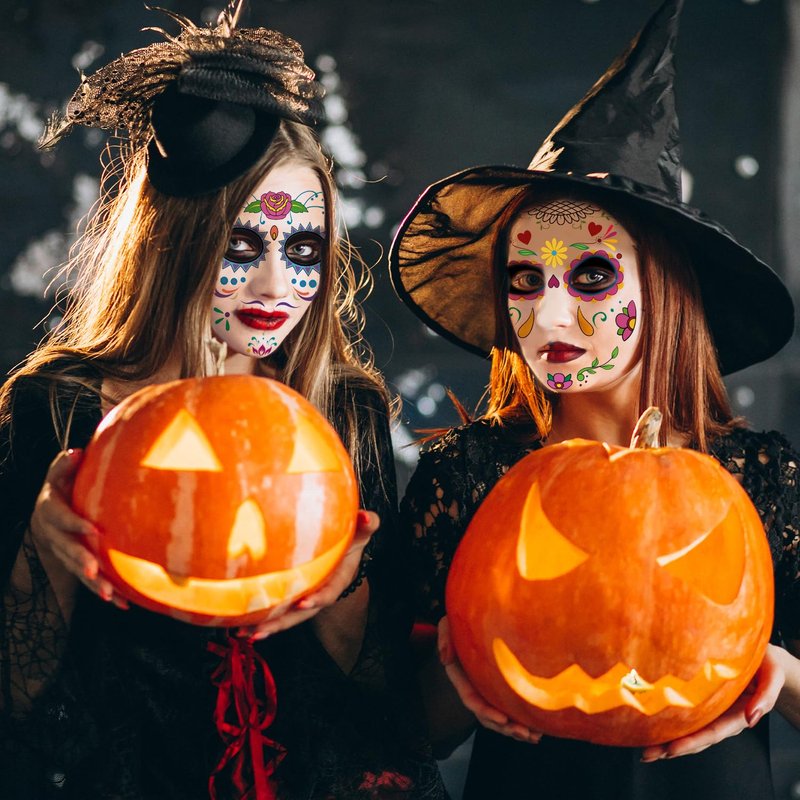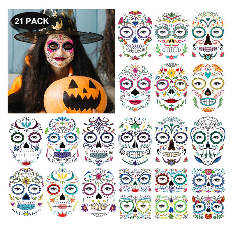 - 【Halloween Make Up】These temporary face tattoos are funny accessories for Halloween theme party and Day of the Dead party. They look real and they can be precisely and creatively placed on the face to add unique eye makeup. And the extra tattoos can be used on the chest, shoulders and hands. Create a unique and unforgettable Halloween for you and your friends.