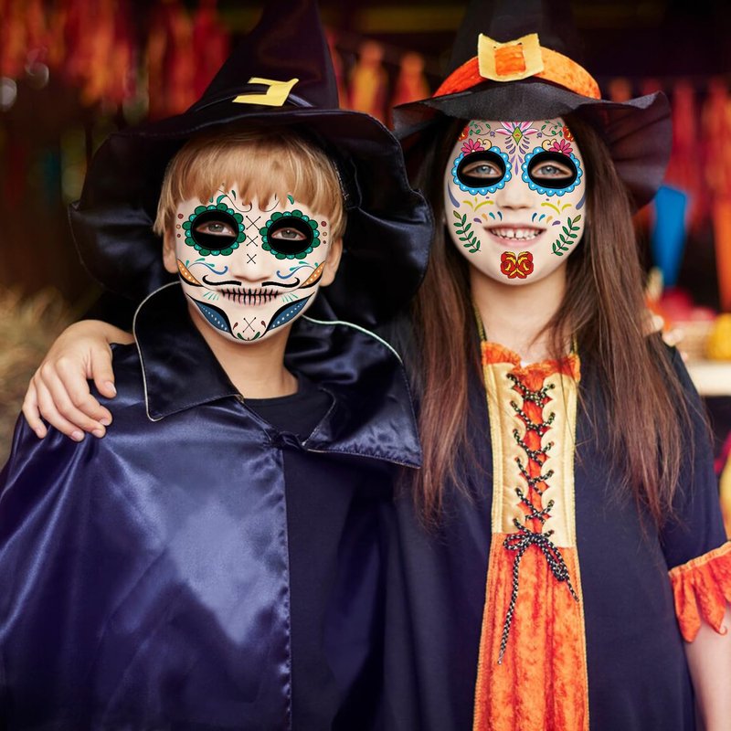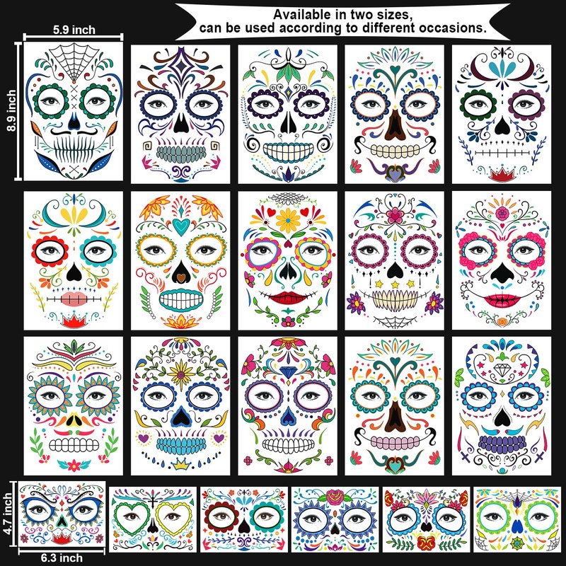 - 【Day of the Dead Temporary Face Tattoos】Package include 21 different styles Day of the Dead face tattoos. Available in two sizes, full face: 21*15 cm/8.3*5.9 inch, half face: 12*16 cm/4.7*6.3 inch, can be used according to different occasions.