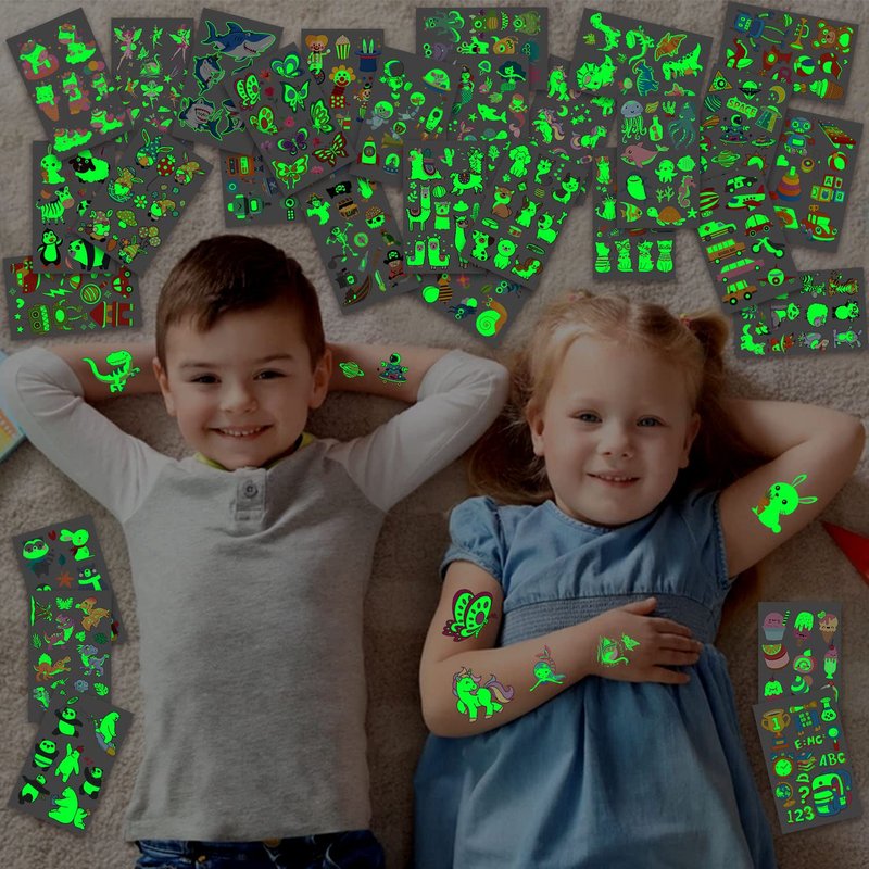 - 【Quantity and Quality】Package contain 30 sheets (380 PCS) luminous tattoos for kids and suitable for boys and girls, this means that every kid at the party can get a luminous and cute tattoo. Each sheet measures 4.7 " x 2.9 ". Our temp tattoos undergo rigorous party testing, the fake tattoos will last all day or more.