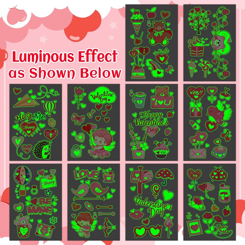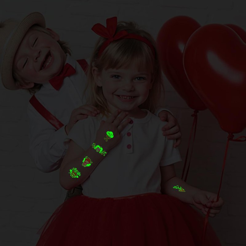 - 【Luminous Temporary Tattoos for Kids Valentine's Day】Glow Valentine's Day tattoos for kids boys girls. Even at a night party with lots of people, these luminous tattoos will make you unique among the crowd! These super cute elements in our fake tattoos include Heart, Love, Lips, Flowers, Roses, Balloons, Cake and other Valentines-related patterns!