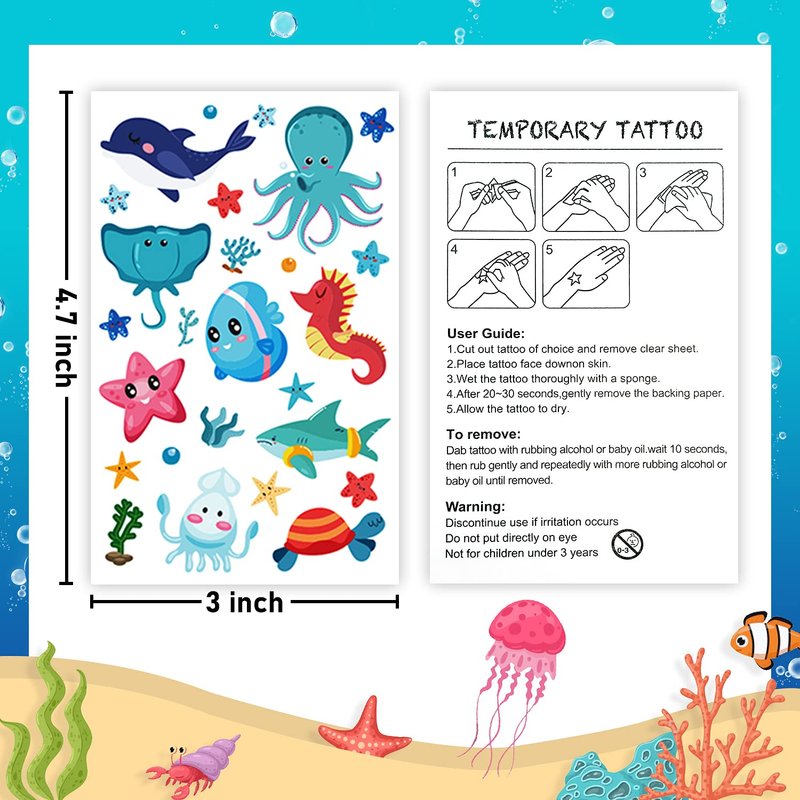 - 【Multi-purpose】These ocean tattoo stickers are suitable for under sea/ocean/pool/beach birthday party decorations, party supplies, party favors, you can also apply them on goodie bags, games and so on. As a preschool toys to let kids know the sea creatures is also a good idea!
