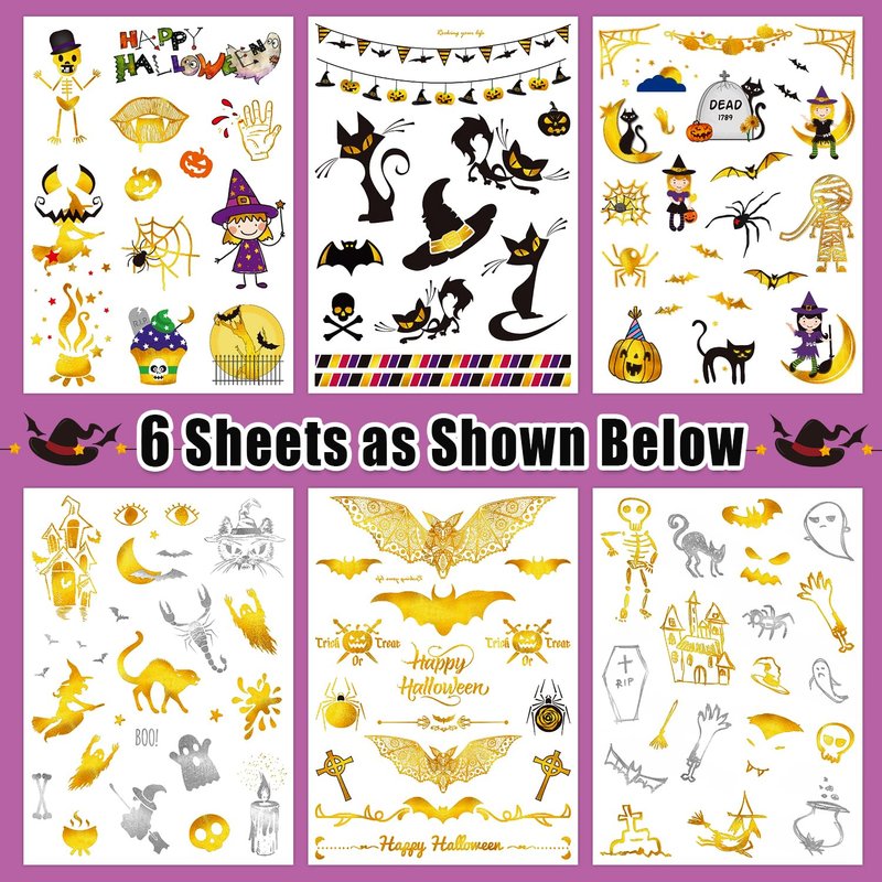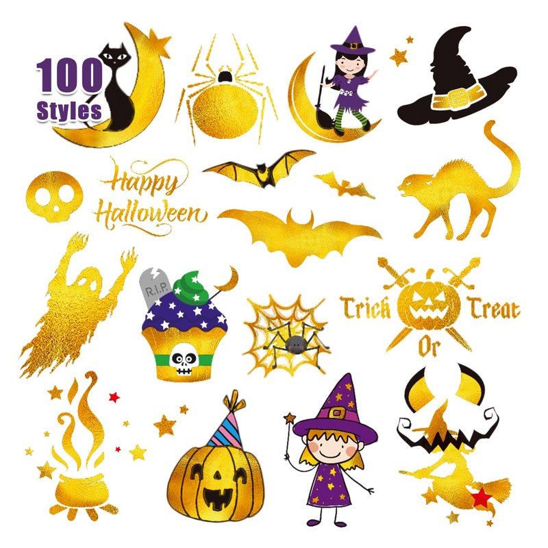 - 【Multiple Uses】These glitter temporary tattoos are great choices for Halloween party supplies, party favors, birthday party decorations, Halloween treats, gifts, goodie bag stuffers, toys, etc. You can also apply them to some smooth objects, such as glass, water bottle, plastic, mobile phone case to decorate your party. Add more fun to Halloween party!